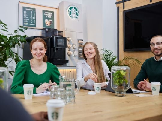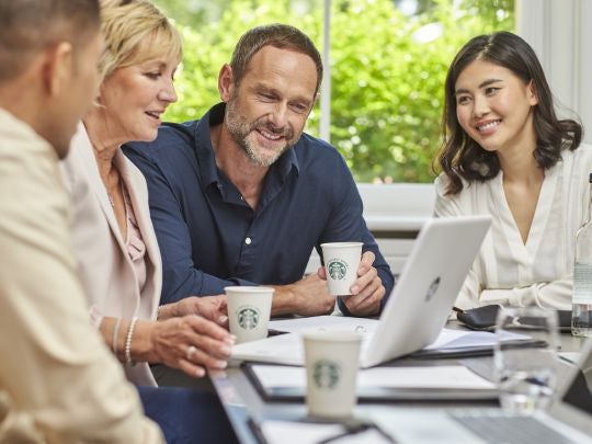 Aumente o número de visitantes e o envolvimento dos funcionários em diversos momentos do dia com as bebidas We Proudly Serve Starbucks® em seu escritório.